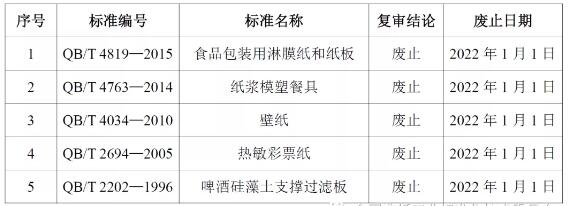 工業(yè)和信息化部2020年12月31日發(fā)布公告(中華人民共和國(guó)工業(yè)和信息化部公告2020年第51號(hào)),公告了一批行業(yè)標(biāo)準(zhǔn)的復(fù)審結(jié)論。其中,QB/T 4819—2015《食品包裝用淋膜紙和紙板》等五項(xiàng)造紙行業(yè)標(biāo)準(zhǔn)予以廢止,廢止日期均為2022年1月1日。具體情況如下: