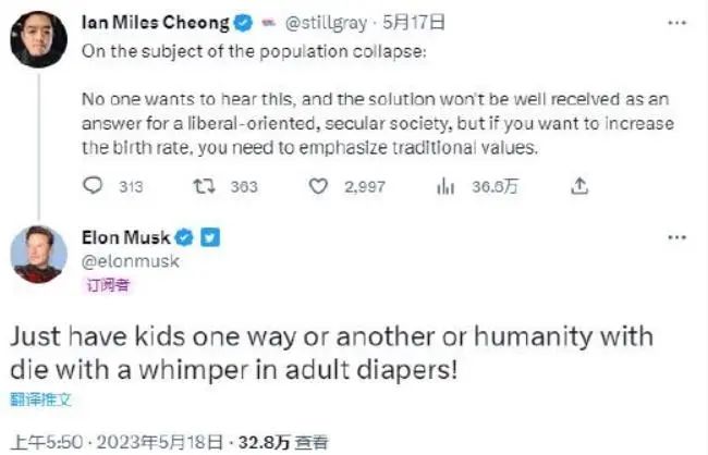 “不管怎樣要生娃,否則人類就會裹著成人紙尿褲在嗚咽聲中消亡!”馬斯克發(fā)推稱。這不是他第一次用成人紙尿褲來形容人口危機(jī)和老齡化問題的嚴(yán)重程度。