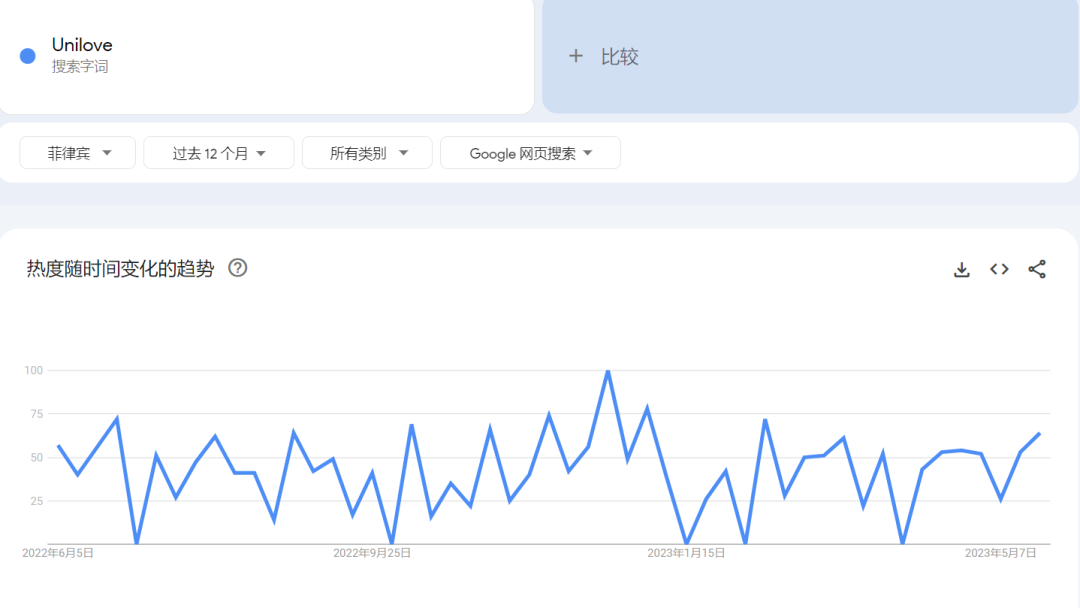 通過Google Trends我們可以了解到一定時(shí)期內(nèi),產(chǎn)品關(guān)鍵詞在搜索引擎上的搜索熱度和市場趨勢(shì)。從下方搜索趨勢(shì)不難看出,菲律賓地區(qū)在2022年全年關(guān)于“unilove”的搜索熱度平穩(wěn),并且在2023年3-4月有上升趨勢(shì),從搜索趨勢(shì)上可以看出,unilove在菲律賓市場形成了穩(wěn)定的品牌曝光。
