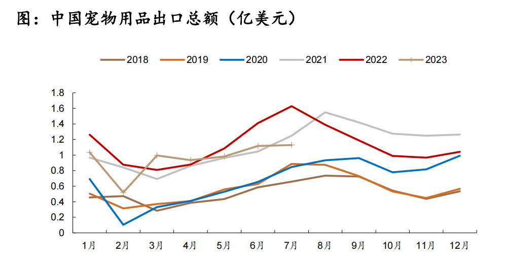 從寵物用品出口數(shù)據(jù)來(lái)看,目前我國(guó)寵物用品出口正在從底部回暖。2023年7月中國(guó)寵物用品以美元口徑計(jì)算出口總額為1.13億美元,同比減少30.64%,環(huán)比增長(zhǎng)1.13%。