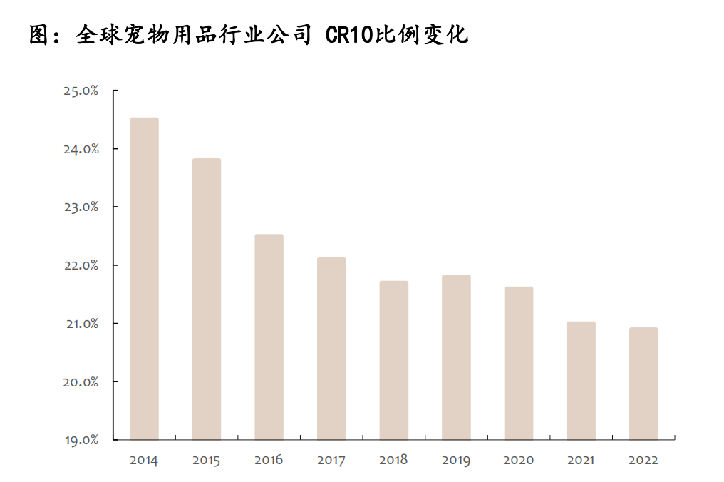 根據(jù)歐睿國(guó)際的數(shù)據(jù),從公司層面來(lái)看,2022年全球?qū)櫸镉镁逤R10(最大的10個(gè)寵物用品公司之和所占的比例)僅為20.9%,2021年CR10為21.0%,而2015年CR10為23.8%,整體來(lái)看全球?qū)櫸镉闷沸袠I(yè)公司CR10呈下降趨勢(shì);2022年CR3僅為9.9%,市場(chǎng)份額top3分別為Central Garden& PetCo、Nestle SA、ElancoAnimal Health Inc,市場(chǎng)份額分別為3.6%、3.4%、2.9%。